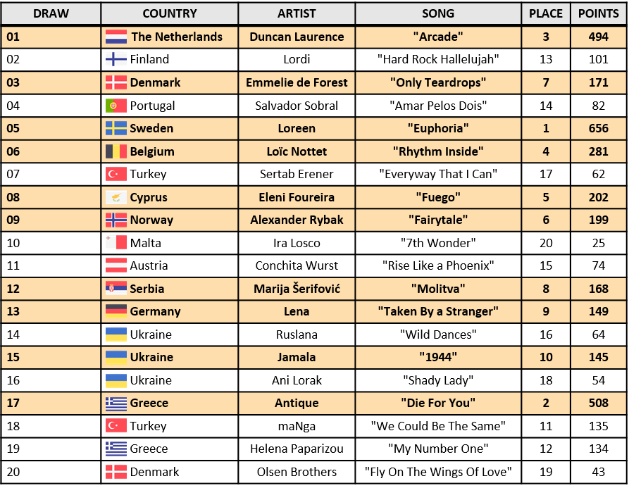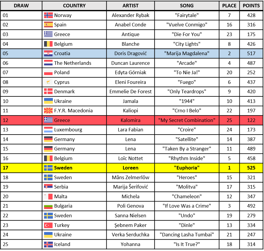 In the grand final, 25 songs competed for the title. Sweden took the win with ''Euphoria'' by Loreen with a total of 525 points. Mention to Croatia as runner-up with ''Marija Magdalena'' by Doris Dragović with a total of 517 points