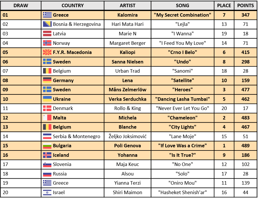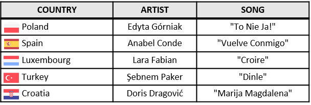 This Season had the Big 5 rule, those 5 songs were selected by me, those songs had to be from previous years to 2000. Those 5 songs had a guaranteed spot in the final: Poland 1994, Spain 1995, Luxembourg 1988, Turkey 1997 and Croatia 1999.